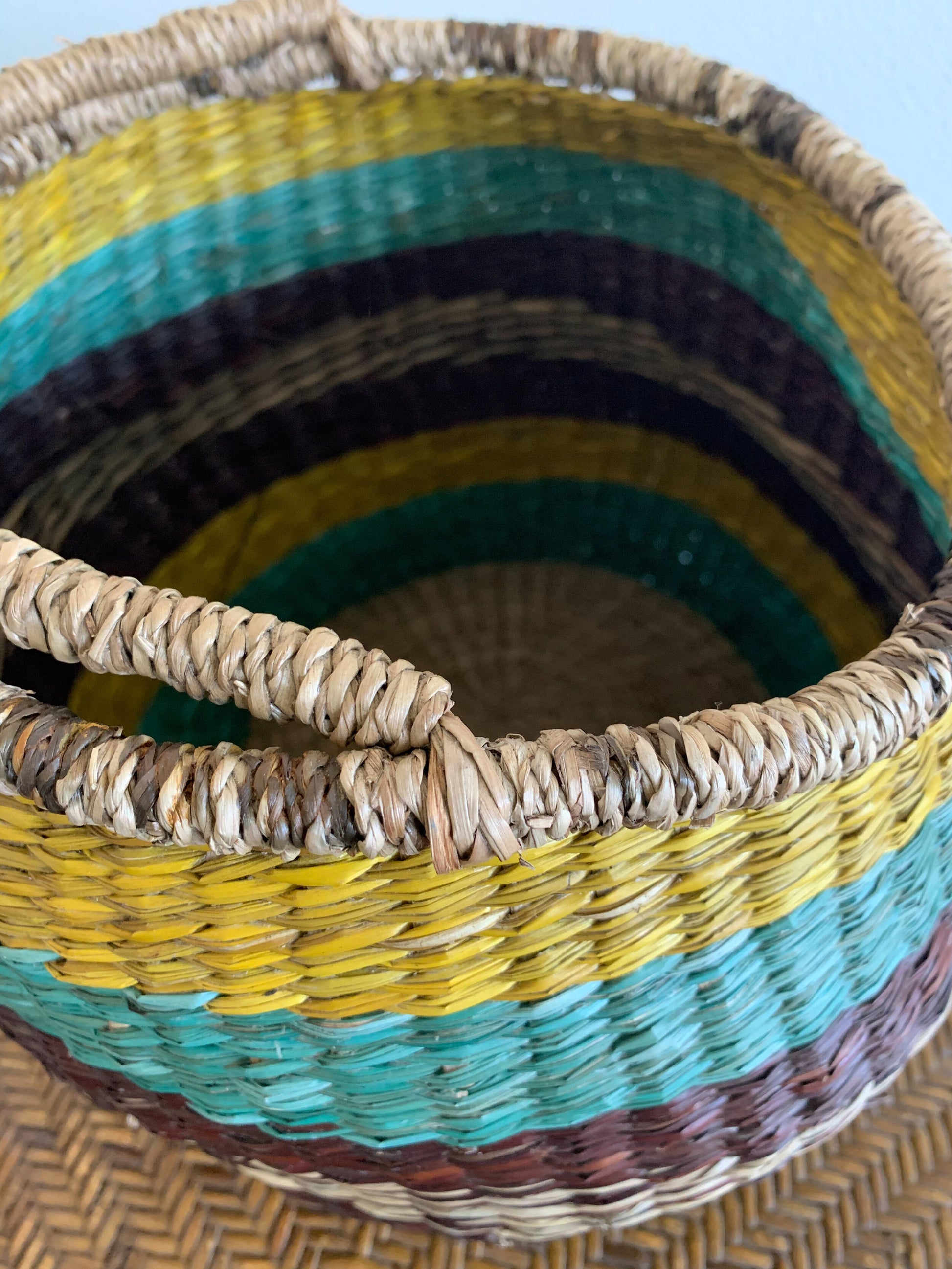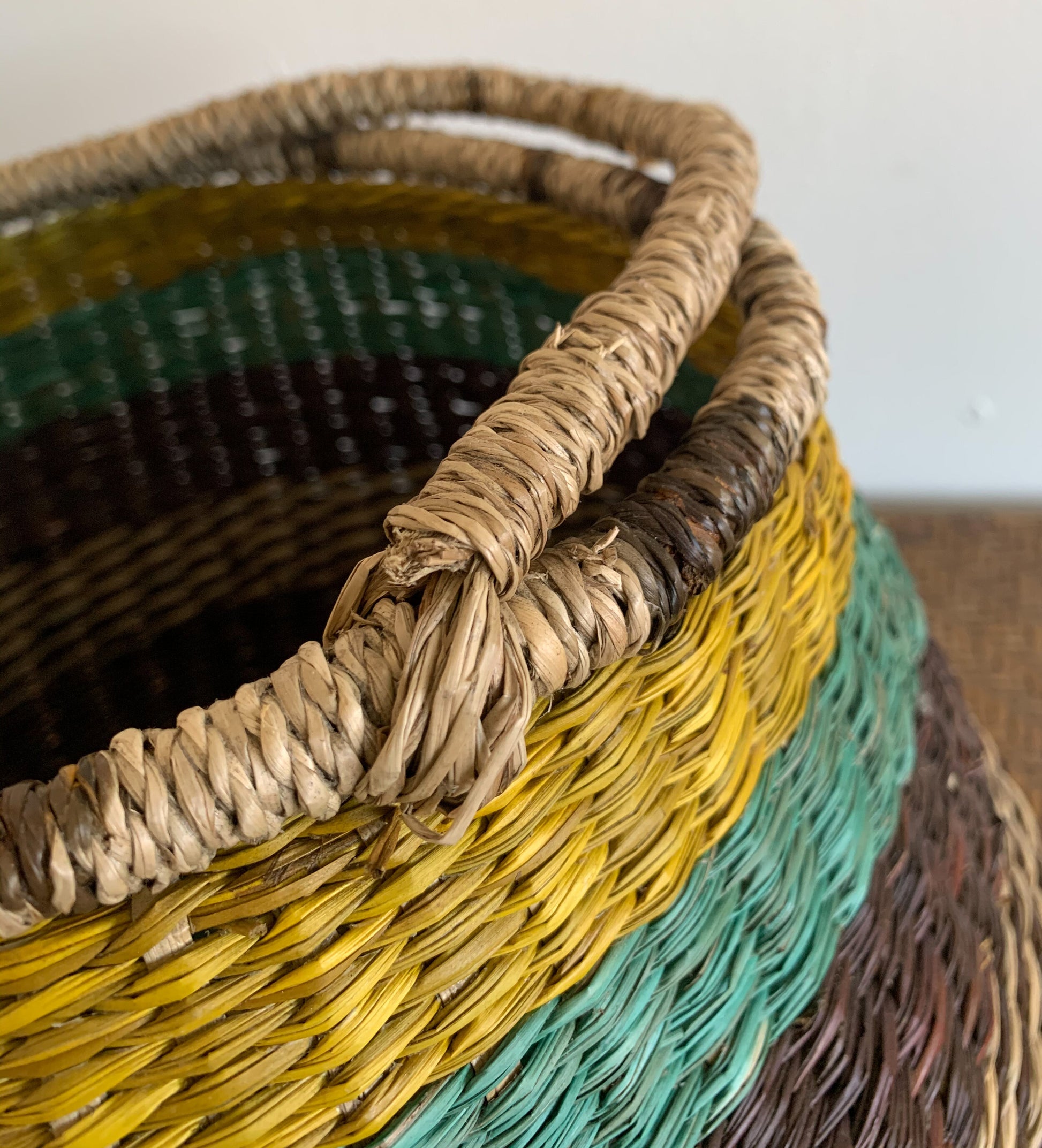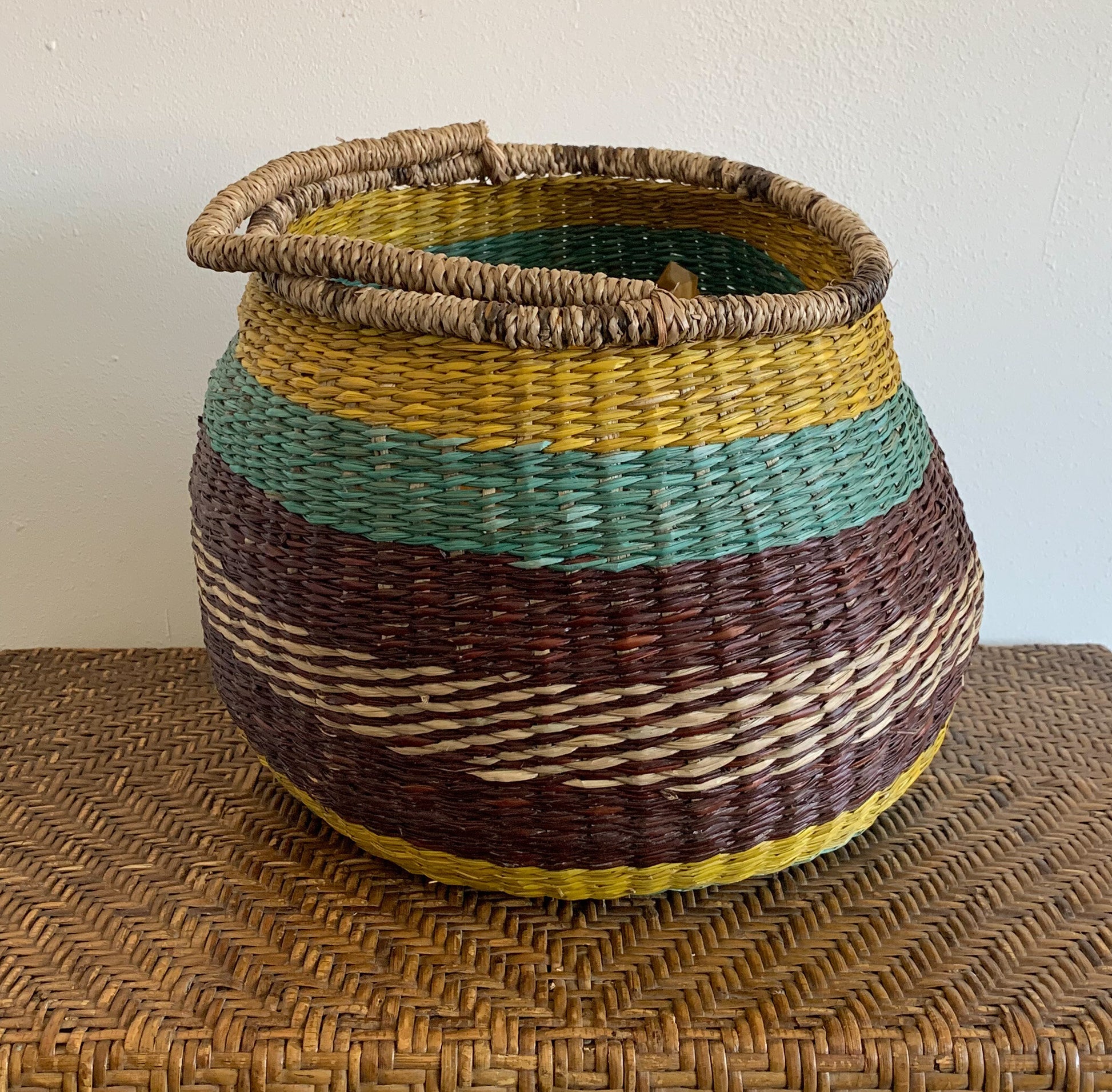 Made from cane and raffia in coloured stripes of turquoise green, brown, yellow and natural and very strong. Very trendy for this summer. Great for storage too. It sits at an angle. Saggy and baggy and full pf character. In great vintage condition.